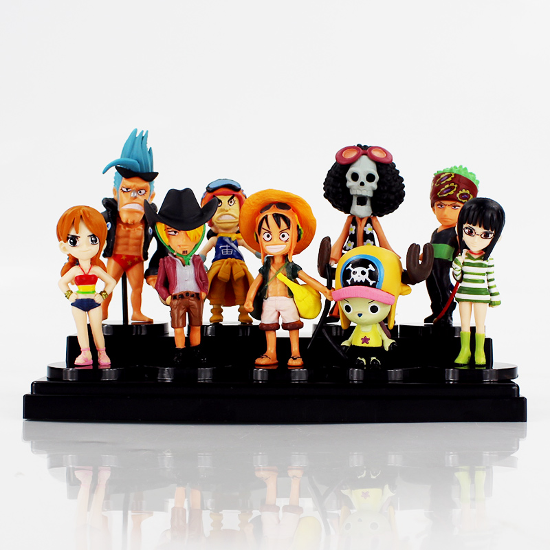 - This One Piece Anime Action Figures Set includes nine meticulously crafted figures of the series’ iconic characters: Luffy, Nami, Robin, Zoro, Sanji, Chopper, Usopp, Brook, and Franky.