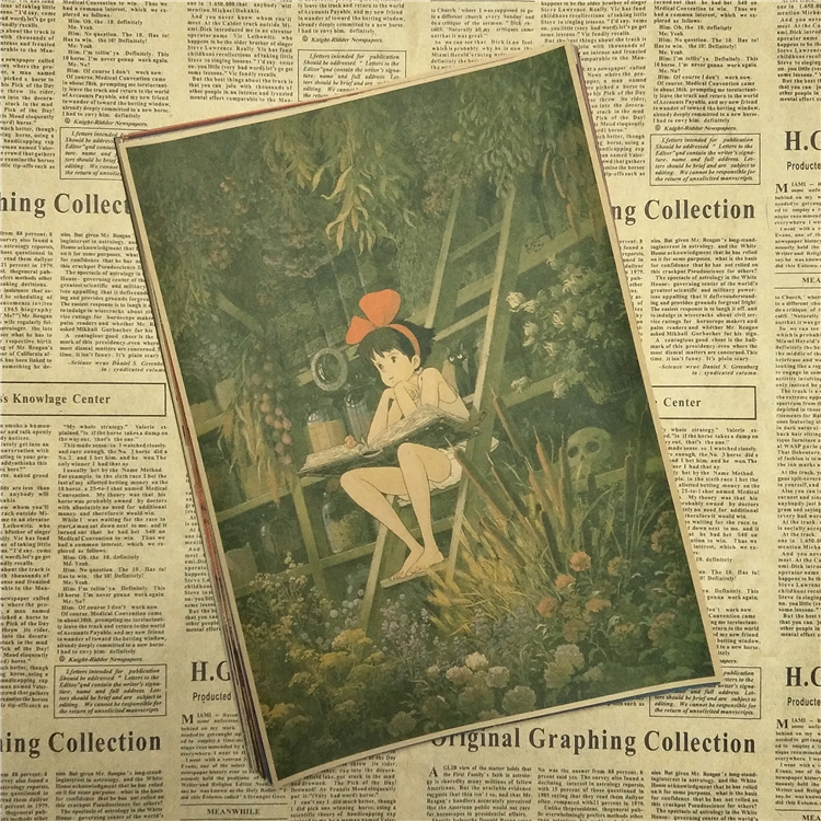 - This is a charming Kraft Paper Poster featuring Hayao Miyazaki’s Kiki’s Service, perfect for fans of the cartoon movie or lovers of unique artwork.