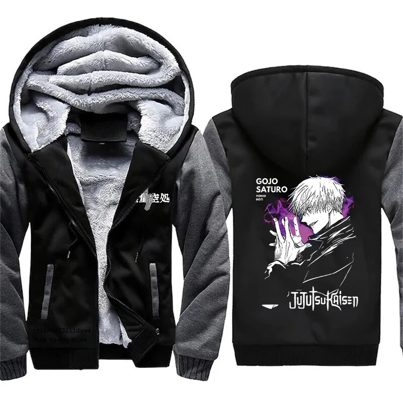Jujutsu Kaisen Mens Winter Jacket Satoru Gojo Anime Print Fleecelined Zipper Hooded Plush Warm Casual Coat