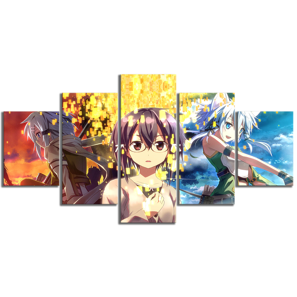 - Stunning 5-panel Sword Art Online Anime Canvas Print, an excellent choice to revamp any wall space with a pop of color and animation.